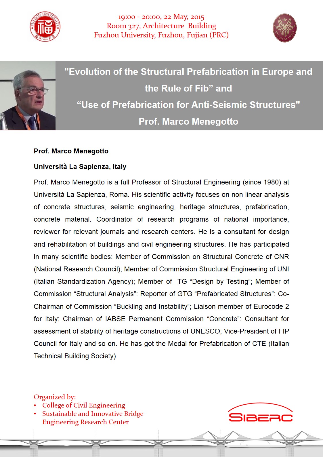 報告主題:"Evolution of the Structural Prefabrication in Europe and the Rule of Fib” and“Use of Prefabrication for Anti-Seismic Structures"